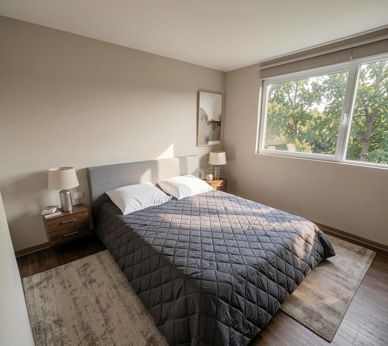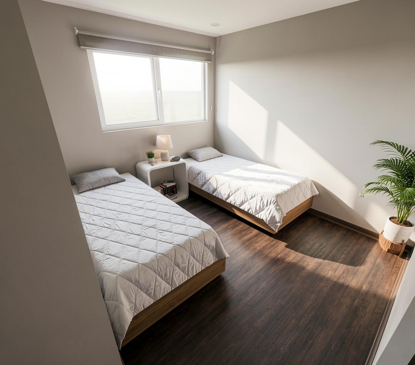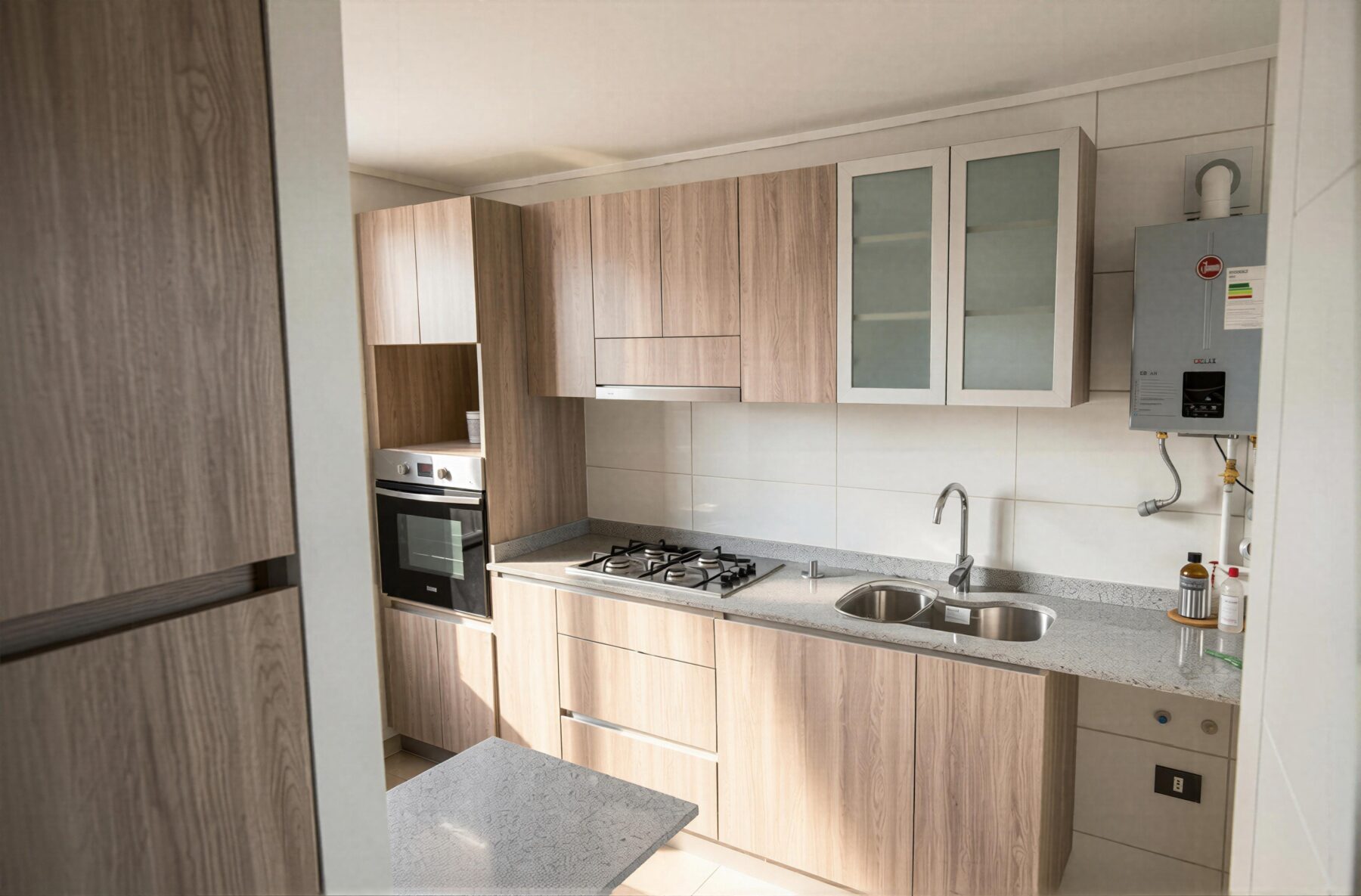 Terminaciones de alta calidad como ventanas termopanel, pavimentos de porcelanato en baños, cocina y living, piso fotolaminado en dormitorios y pasillos, y cubiertas de granito en la cocina.